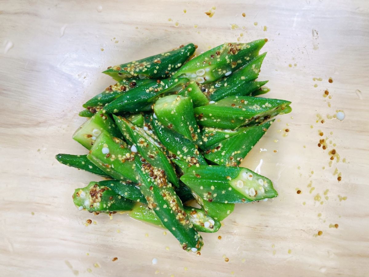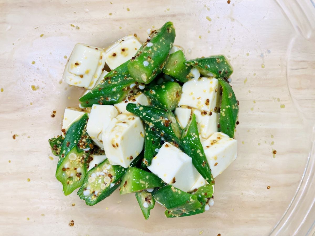 ポイント豆腐が崩れやすいので、先にオクラをしっかり調味料と和えてから加えます。