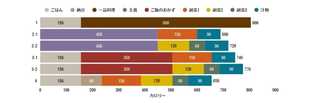 パターン2と同様に、副菜を1つにするか2つにするかで分かれています。